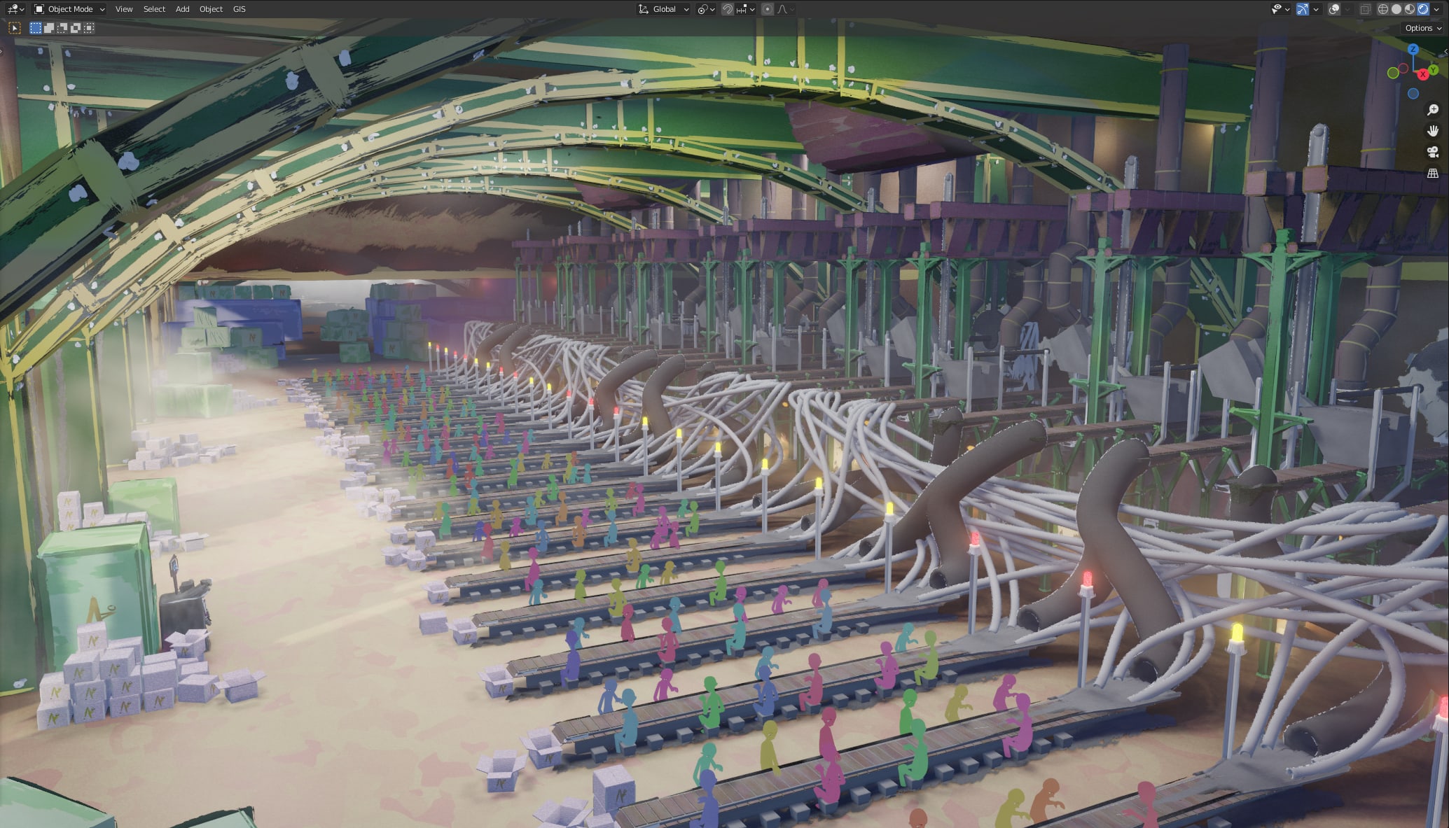 The characters were rigged and animated in Maya, then exported into Blender for stylized rendering.